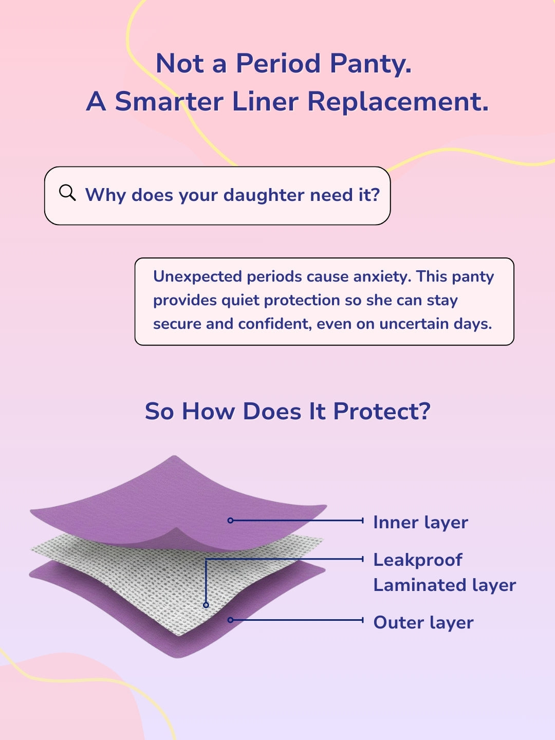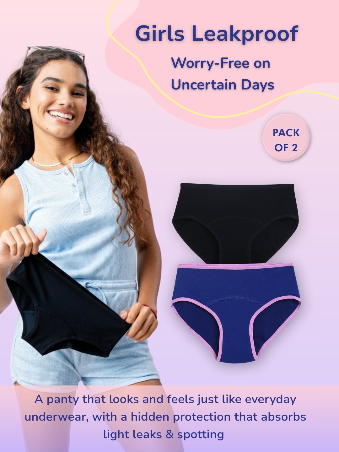 The Mackly Girls Leak-Proof Innerwear is designed as a liner-replacement solution not a brief and not a full period panty. It is ideal for light protection during unsure days, irregular cycles, spotting, long school hours, or travel, helping girls stay comfortable and confident without the need for disposable panty liners.