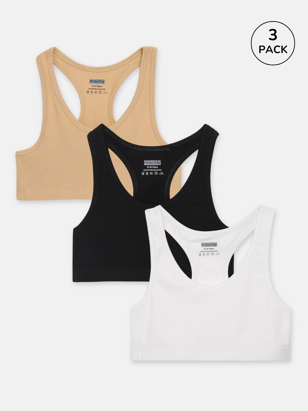 The Mackly Girls Racerback Trainer Bra – Pack of 3 is thoughtfully designed for young girls beginning their innerwear journey, offering gentle support and all-day comfort. Made from soft, breathable cotton knit, this non-padded, wire-free bra feels light and soothing on sensitive skin.