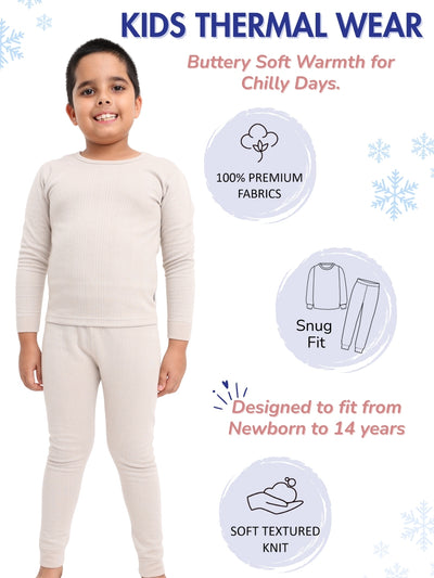 Stay warm and comfortable this winter with our ribbed thermal top and bottom set. The top has a round neck and full sleeves with ribbed cuffs, while the bottom has an elasticated waistband with slip-on closure and cuffed hems. This stylish ensemble will keep you baby & kid cozy all season long.