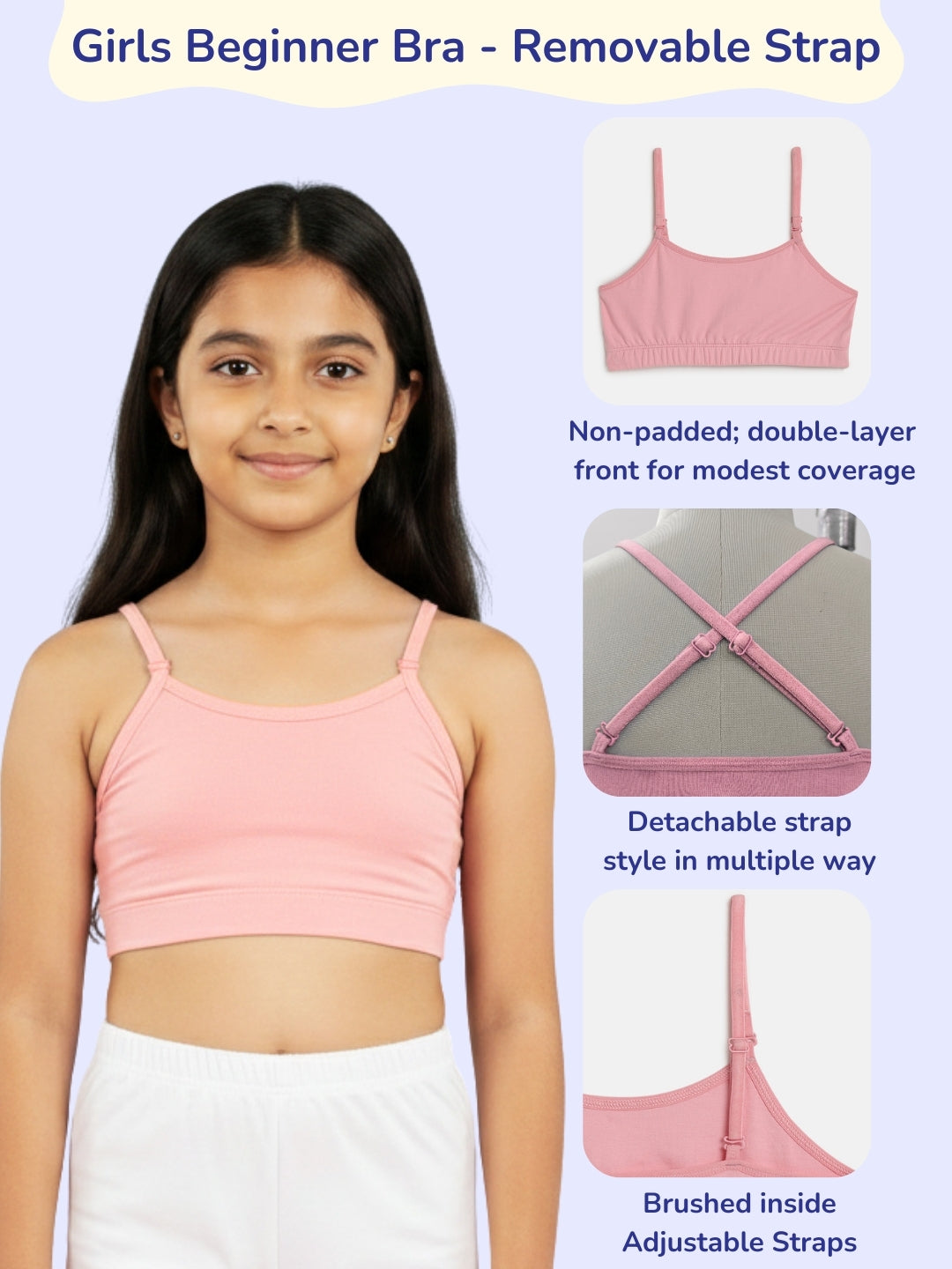 With removable, adjustable straps, this bra can be worn as a regular strap style or crisscrossed for different outfits—perfect for school, play, or everyday wear.