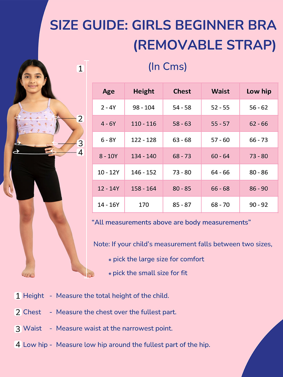This beginner-friendly bra is thoughtfully designed for growing girls (ages 8–16), offering gentle support, flexible styling, and all-day comfort. Crafted from a soft cotton-Lycra jersey (95% cotton, 5% elastane), it feels smooth on sensitive skin while allowing natural stretch for easy movement. The double-layer front provides modest coverage without padding, making it ideal for early development stages.