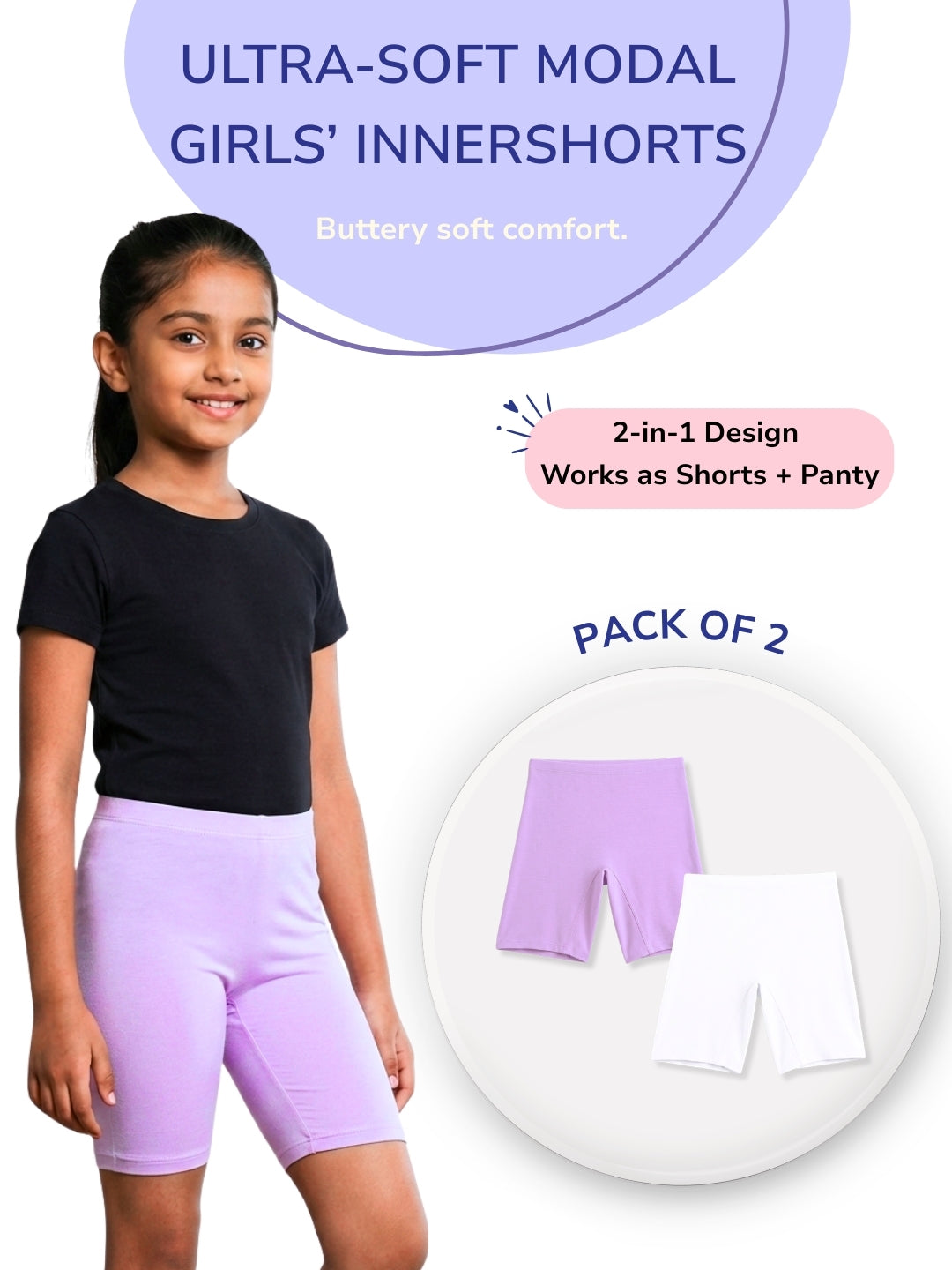 Girls Modal Innershorts - Pack of 2 (Lavender & White)