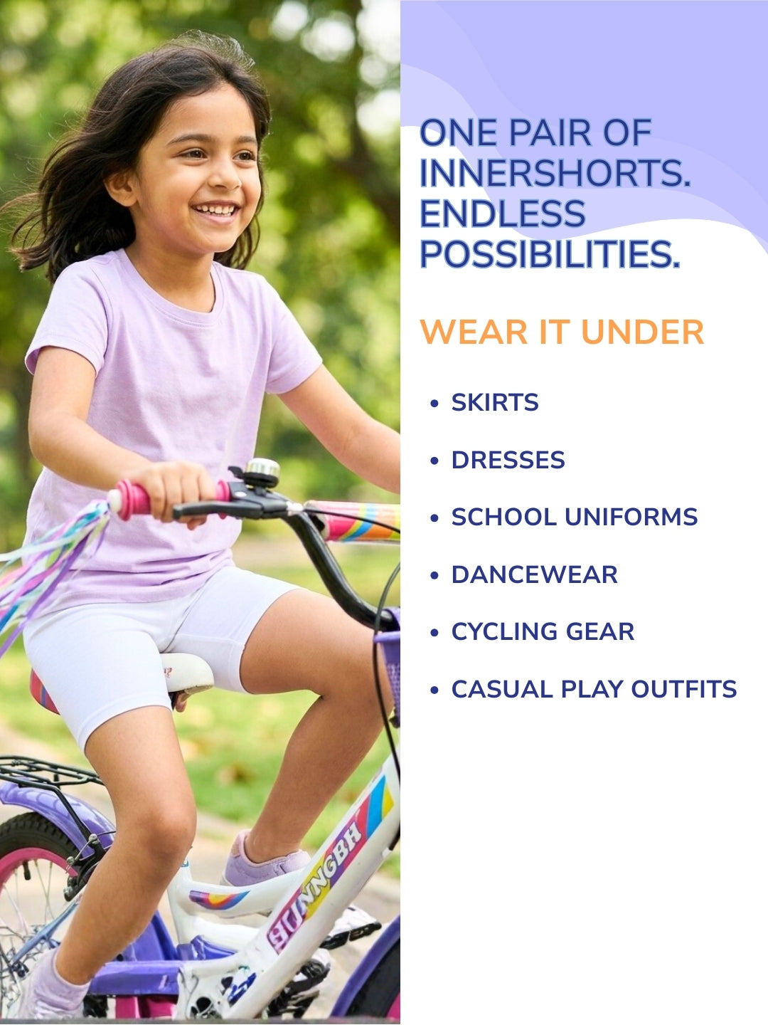 Designed with a smart 2-in-1 built-in gusset, they replace the need for separate panties, reducing layering, bulk, and discomfort. Whether worn under skirts, dresses, frocks, school uniforms, or even on their own, these innershorts stay in place, feel feather-light, and move effortlessly with the child.